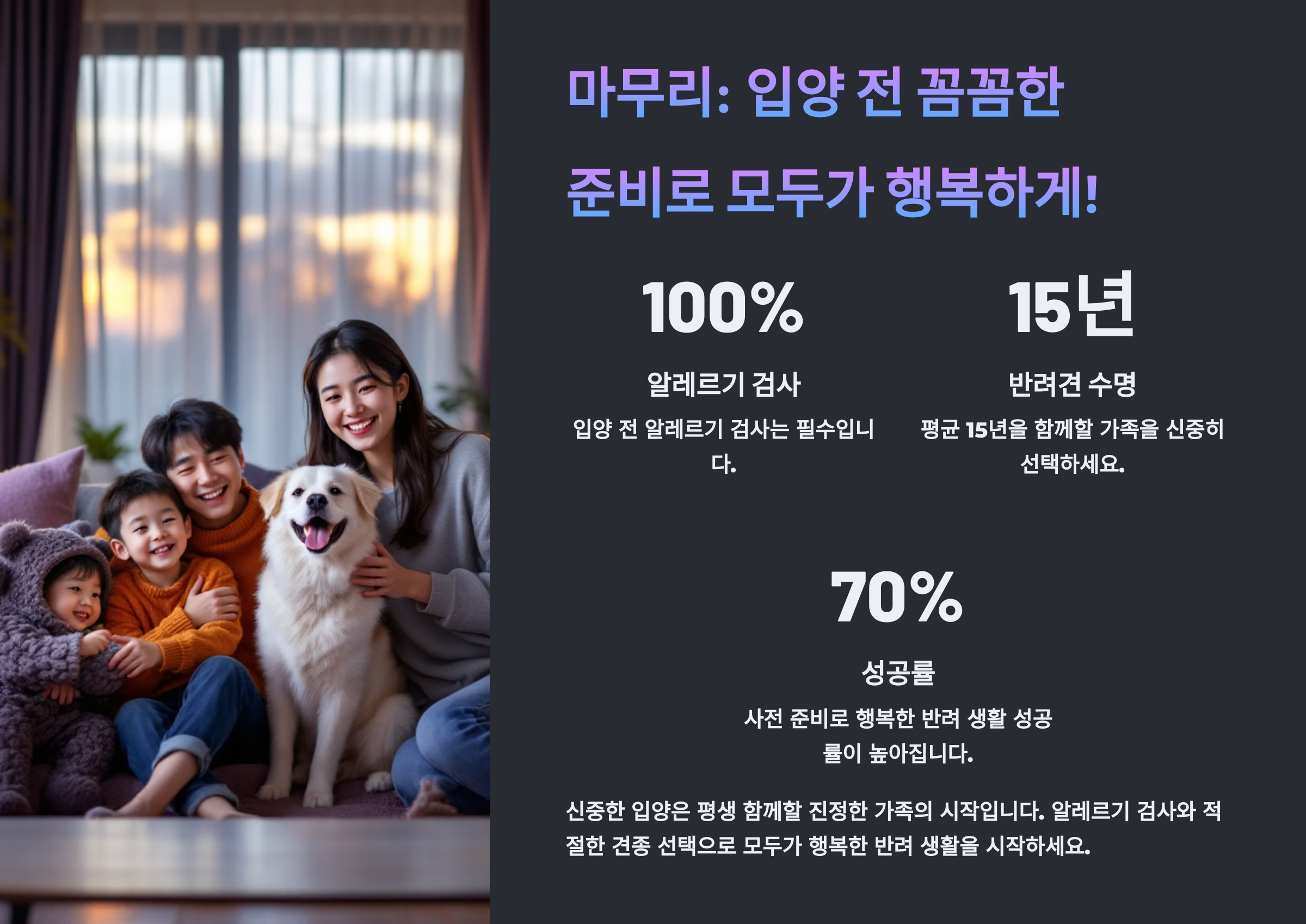 반려견을 맞이하는 건 '나'만의 선택이 아닌, 가족 전체의 결정이기도 해요. 모두가 행복한 선택을 하기 위해, 건강부터 확인하는 것이 가장 아름다운 시작이에요. 👨👩👧👦🐾