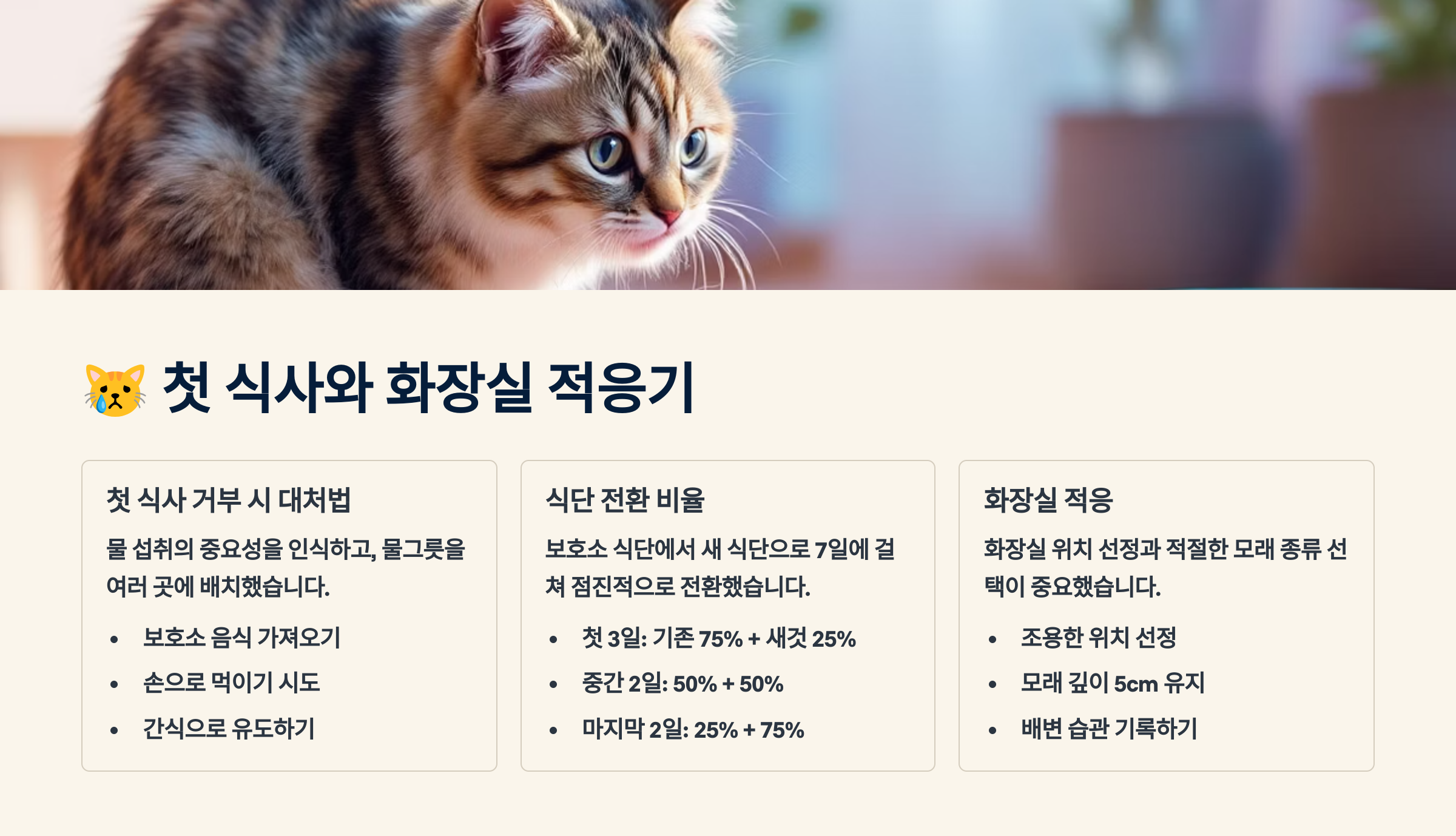 식사와 배변은 고양이가 새로운 환경에서 적응 중이라는 강력한 신호예요. 이 과정을 조심스럽게 관찰하면서도 아이에게 지나친 관심을 보이지 않는 것이 중요해요. 저는 식사 그릇의 내용물 변화로 상태를 체크하고, 화장실 사용 여부는 모래 상태로만 확인했어요. 아이의 프라이버시도 존중받아야 하니까요. 😺
