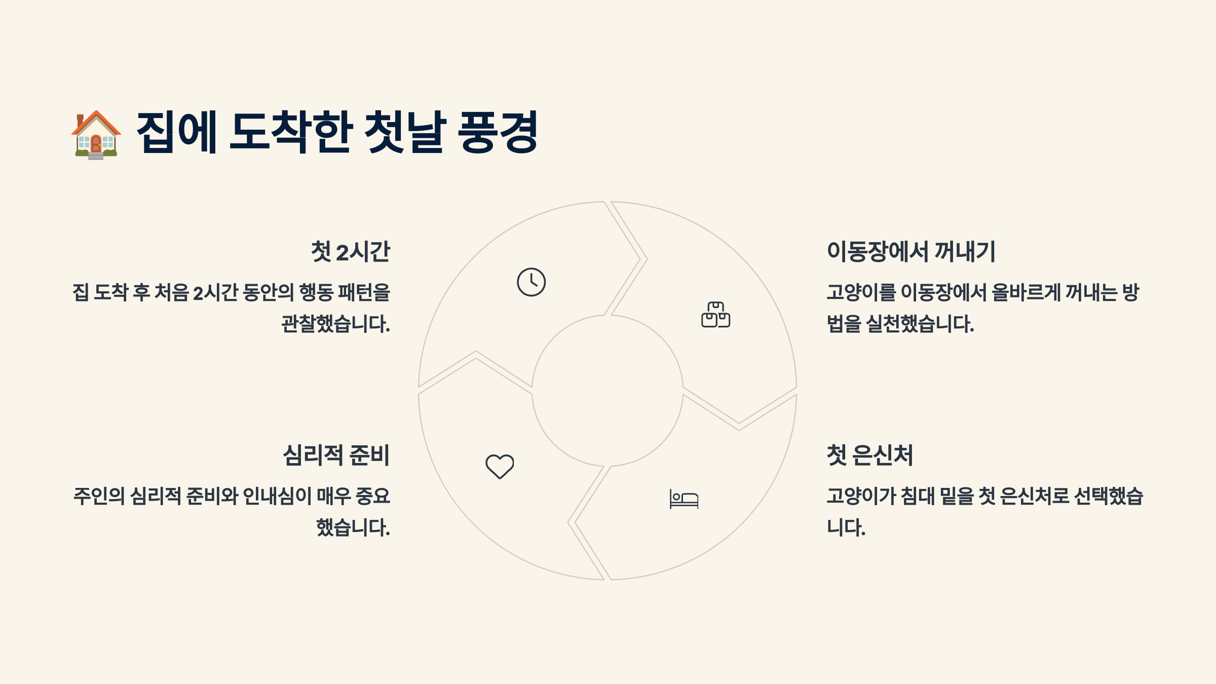 집에 도착했을 때, 저는 조심스럽게 아이를 안고 실내로 들어왔어요. 이동장 안에서 꺼낼 때도 손끝에 힘이 들어갔지만, 가능한 부드럽게, 천천히 움직이려 했어요. 무엇보다 중요한 건, 이 순간을 조심스럽고 긍정적인 기억으로 남겨주고 싶었기 때문이에요. 아이의 첫 기억이 두려움뿐이면 너무 슬프잖아요. 🥹