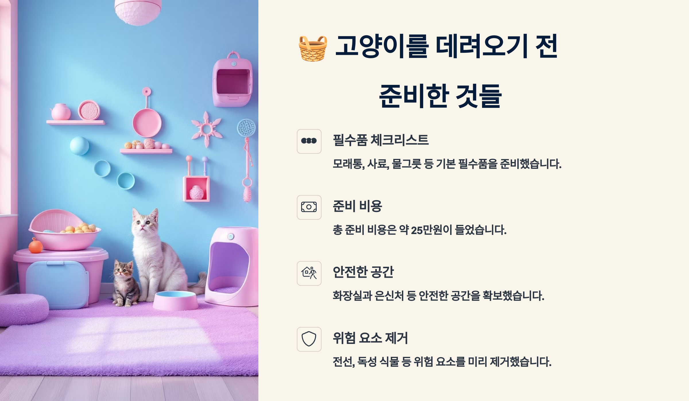 입양 전에 무엇보다 중요한 건, 고양이의 관점에서 생각하는 준비예요. 사람 기준으로 예쁜 물건, 귀여운 공간보다는 고양이가 안정감을 느끼고 두려움을 최소화할 수 있도록 배려하는 게 우선이에요. 특히 유기묘일수록 이런 사소한 배려가 적응 속도에 큰 영향을 주더라고요.