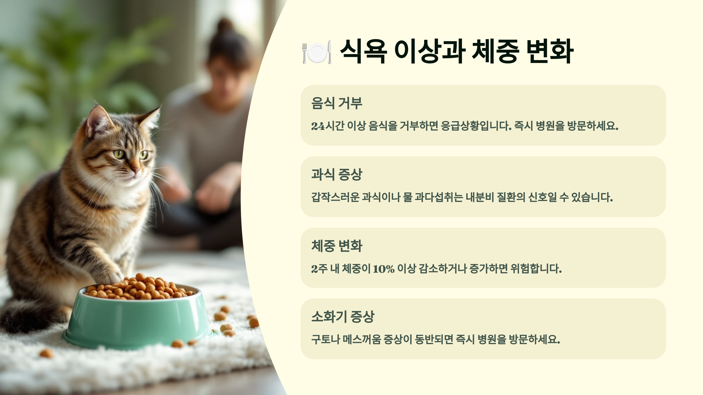 1주일 내 5% 이상 급격한 체중 감소는 단순 소화 문제가 아니라, 간·신장 기능 저하나 호르몬 이상일 수도 있어요. 그 어떤 변화보다 빠르게 병원을 방문해야 하는 신호예요. 🚨