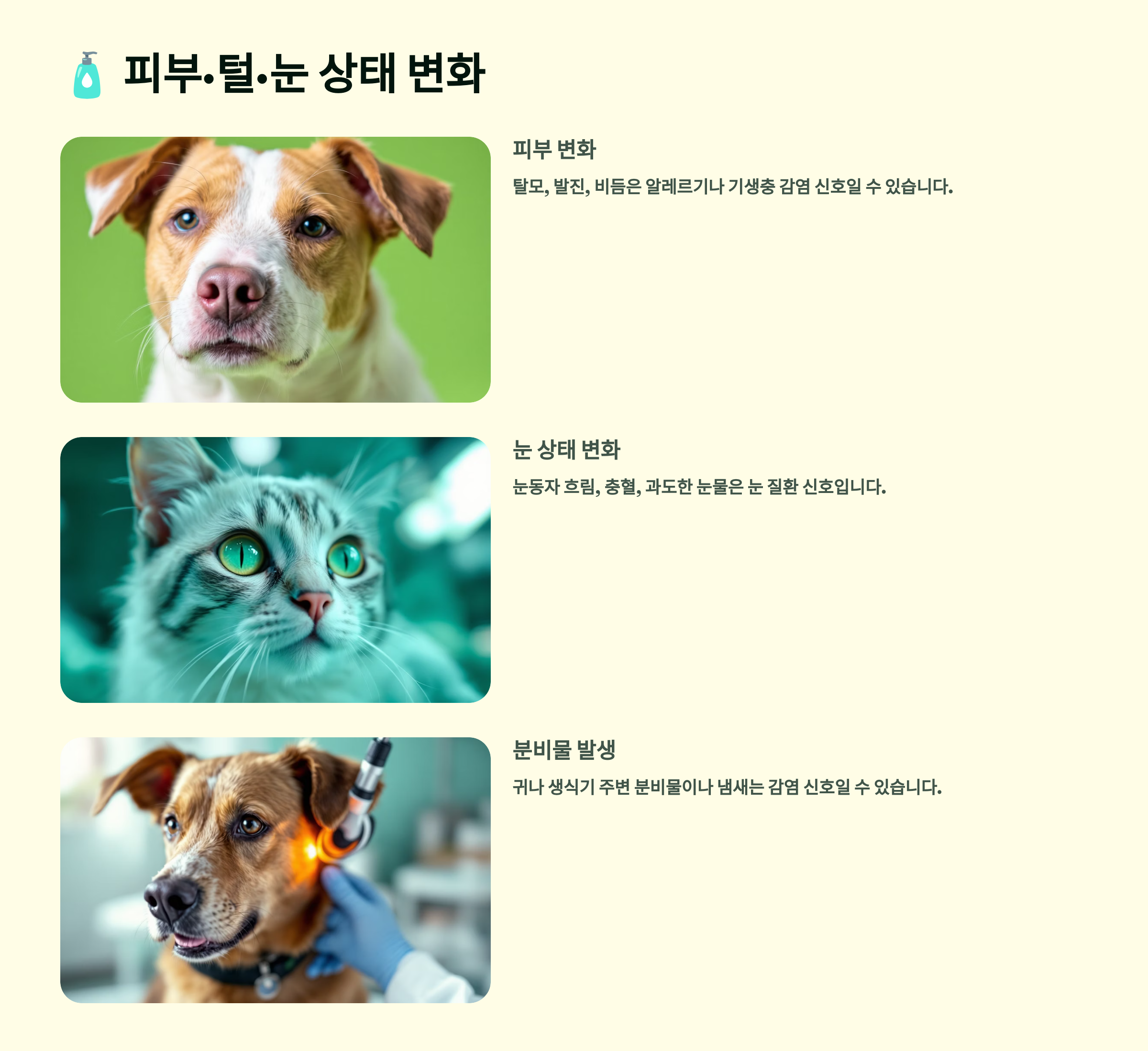 반려동물의 건강 이상은 눈에 보이는 외형에서도 나타나요. 특히 피부, 털, 눈은 건강 상태를 직관적으로 보여주는 부위라 조금이라도 평소와 다르면 빠르게 확인해보는 게 좋아요. 👁️🐾