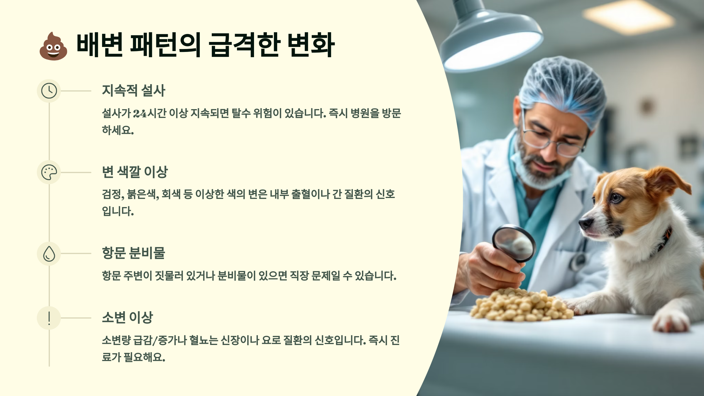 가장 주의해야 할 건 설사와 혈변이에요. 물처럼 흐르는 설사, 선홍색 피가 섞인 변감염, 기생충, 장염, 스트레스 등 다양한 원인을 암시할 수 있어요. 🚨